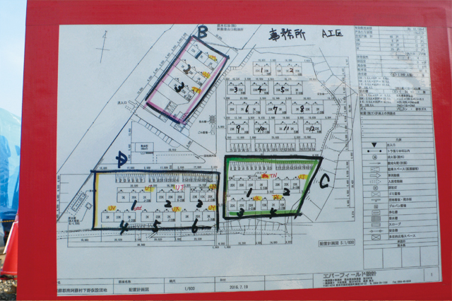 7月20日から始まり、建設現場は10班(約60人)に分かれ、1棟2班(約10人)で2日間で1棟を建てていく工程です。8月8日までに25棟の建て方を行いました。8月に入り作業員も100人以上になり、各棟に分かれて仕上げていきました。工期は少し延びて9月中旬までだそうです。