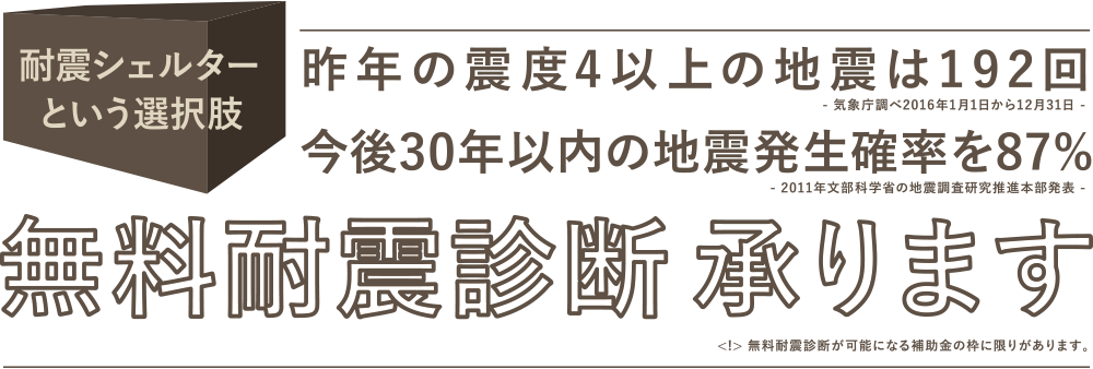 従来の耐震補強と言うと外壁を外し、耐震補強をする方法や、既存の住宅の外側に新たな補強柱を設置するなど大掛かりな補強が多く、 工事期間・工事費用共に高額化する傾向にあります。 弊社が開発した耐震シェルターは従来の大型補強をすることを見直し、倒壊しにくいシェルターを既存家屋の中に設置するというものです。 旧耐震基準(昭和56年以前)の木造住宅にも設置可能など、メリットも多く、震災に強い安全な空間を確保することが可能です。